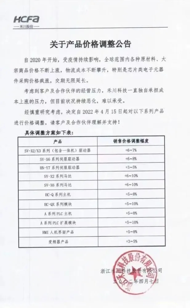 事實上,原材料價格上漲最先影響的是工業機器人上游零部件領域,相關企業也因此早早的發布了漲價通知,國內的匯川技術、禾川科技等,還有國外的ABB、安川電機、施耐德、愛德克、西門子、歐姆龍、艾默生、三菱等一眾工業自動化巨頭企業。