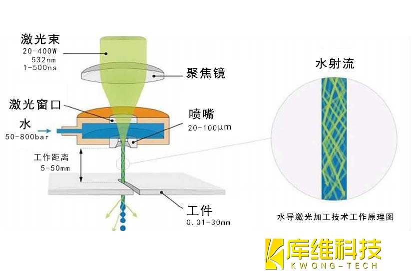 原理:利用激光通過壓力調(diào)制的水腔,將激光束聚焦在噴嘴上,形成光波導(dǎo),從而引導(dǎo)激光切割。