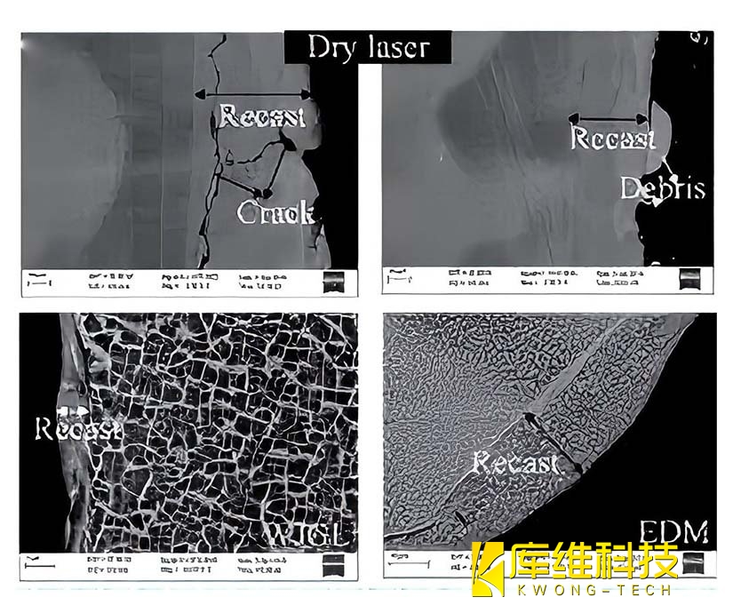 3、“干激光”、電火花加工和水導激光工藝下孔洞重鑄層的SEM圖