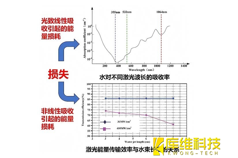 水對(duì)激光的吸收系數(shù)隨波長(zhǎng)顯著變化(圖1 上)。紫外波段(如 355nm)吸收系數(shù)極高,能量易被水快速吸收,導(dǎo)致傳輸損耗;紅外波段(如 1064nm)吸收系數(shù)較低,能量可在水束中長(zhǎng)距離傳輸。例如,1064nm 激光在水中的吸收損耗小,更適合作為水導(dǎo)激光的工作波長(zhǎng),以減少能量衰減,提升傳輸效率。